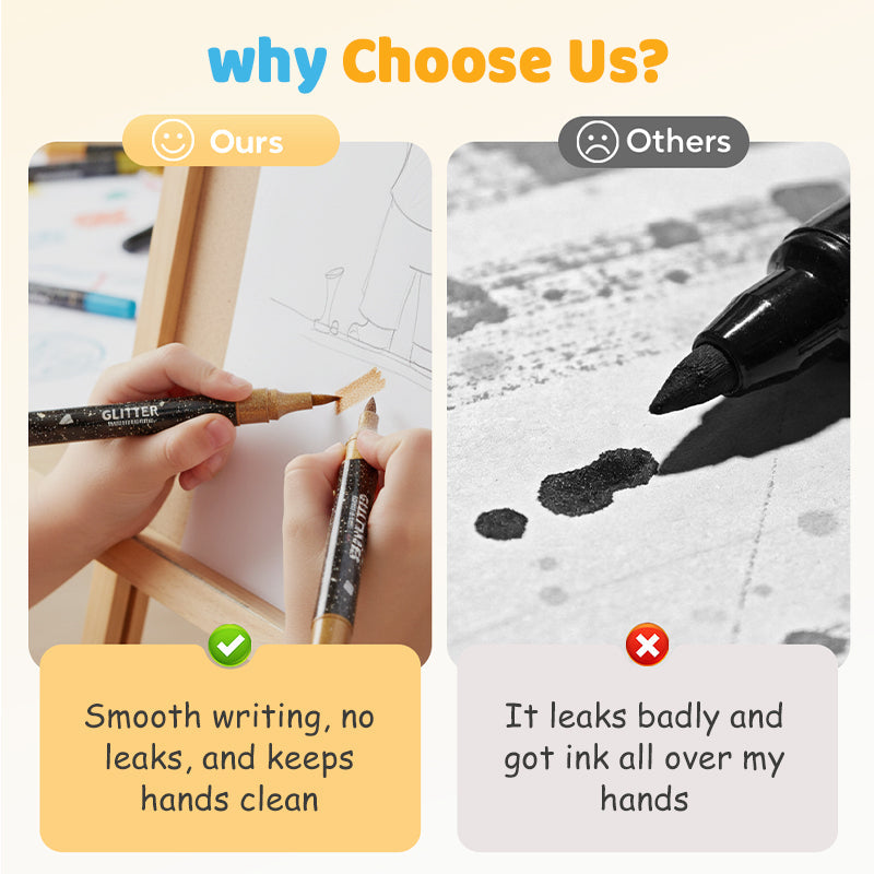✅ Rebouchez immédiatement après usage pour éviter le dessèchement. ✅ Stockez à l'horizontal pour une meilleure fluidité de l'encre. ✅ L'intensité du glitter peut varier selon le type de papier.
